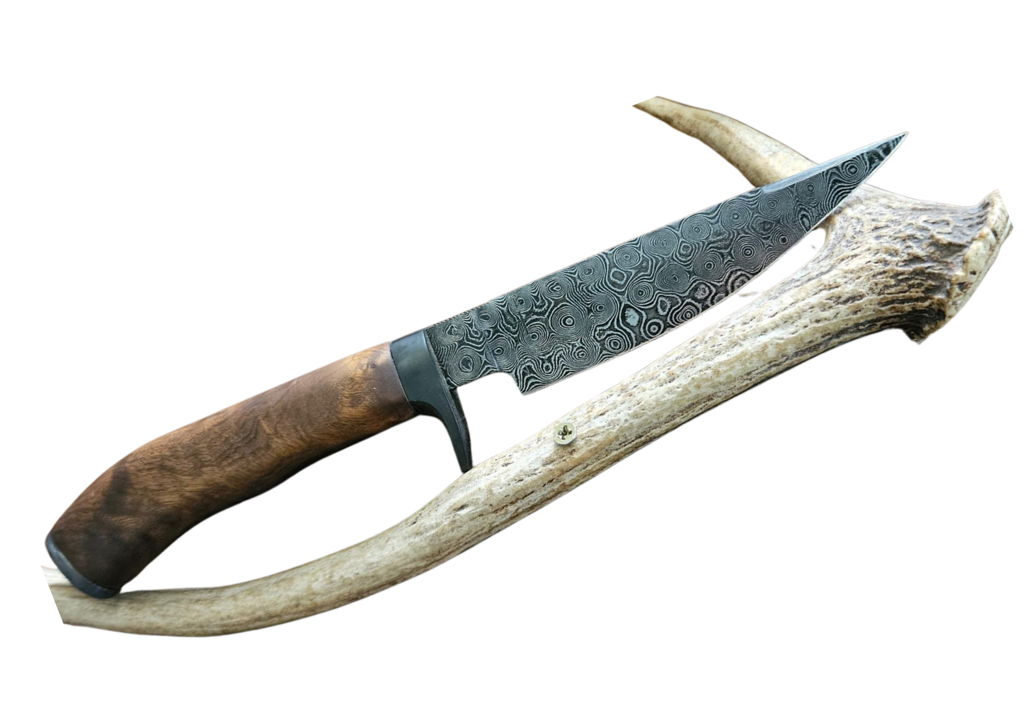 Largura de 3,0 cm e dorso de 0,4 cm, oferecendo equilíbrio entre resistência e precisão. Cabo em madeira estabilizada COM POMO EM DAMASCO durável e bonito